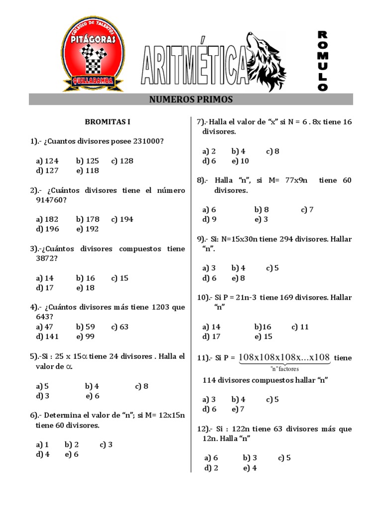 tiene 60 divisores. 12).- Si : 122n tiene 63 divisores más que