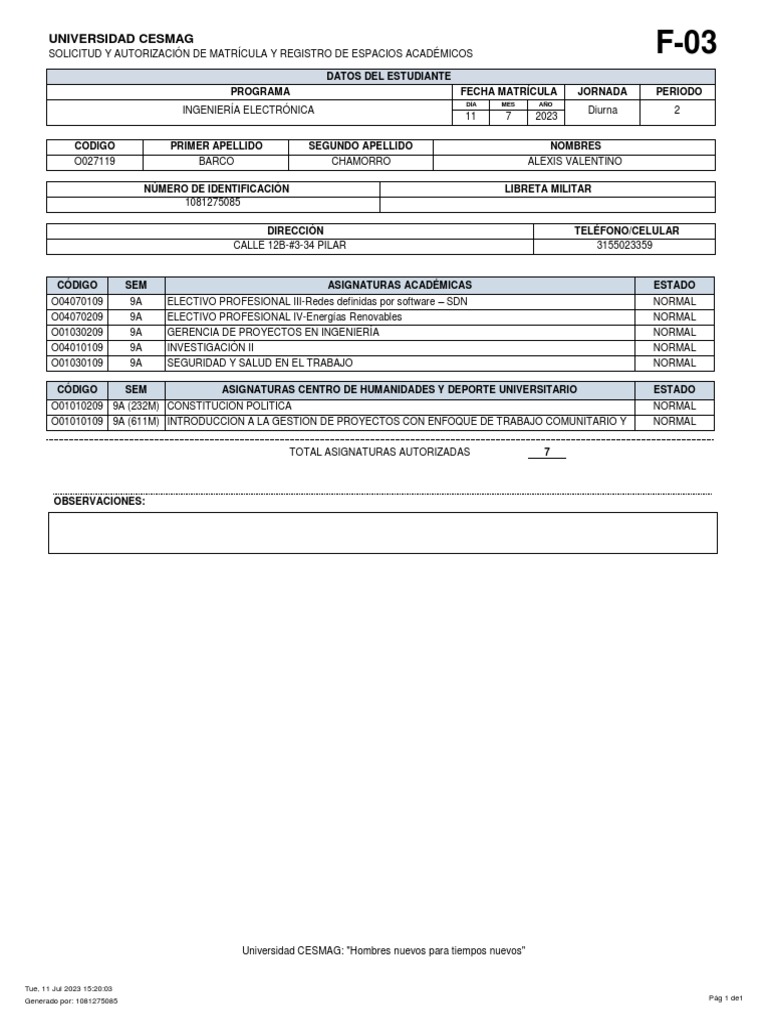 académico, registro de los espacios académicos y semestre a cursar) y el formato de adición o cancelación de