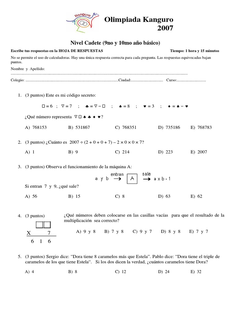 No se permite el uso de calculadoras. Hay una única respuesta correcta para cada pregunta. Las respuestas equivocadas bajan