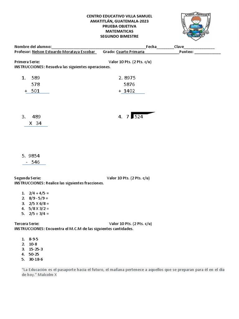 Profesor: Nelson Estuardo Morataya Escobar Grado: Quinto Primaria Punteo: ____________