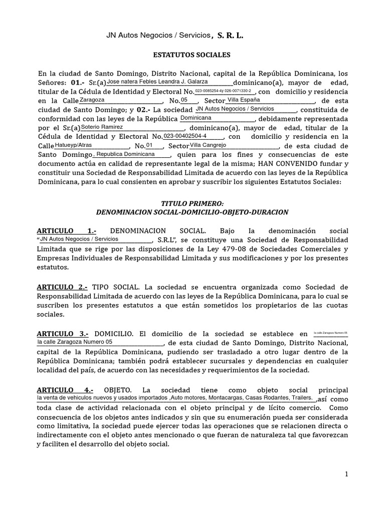 “_______________________________________, S.R.L”, se constituye una Sociedad de Responsabilidad