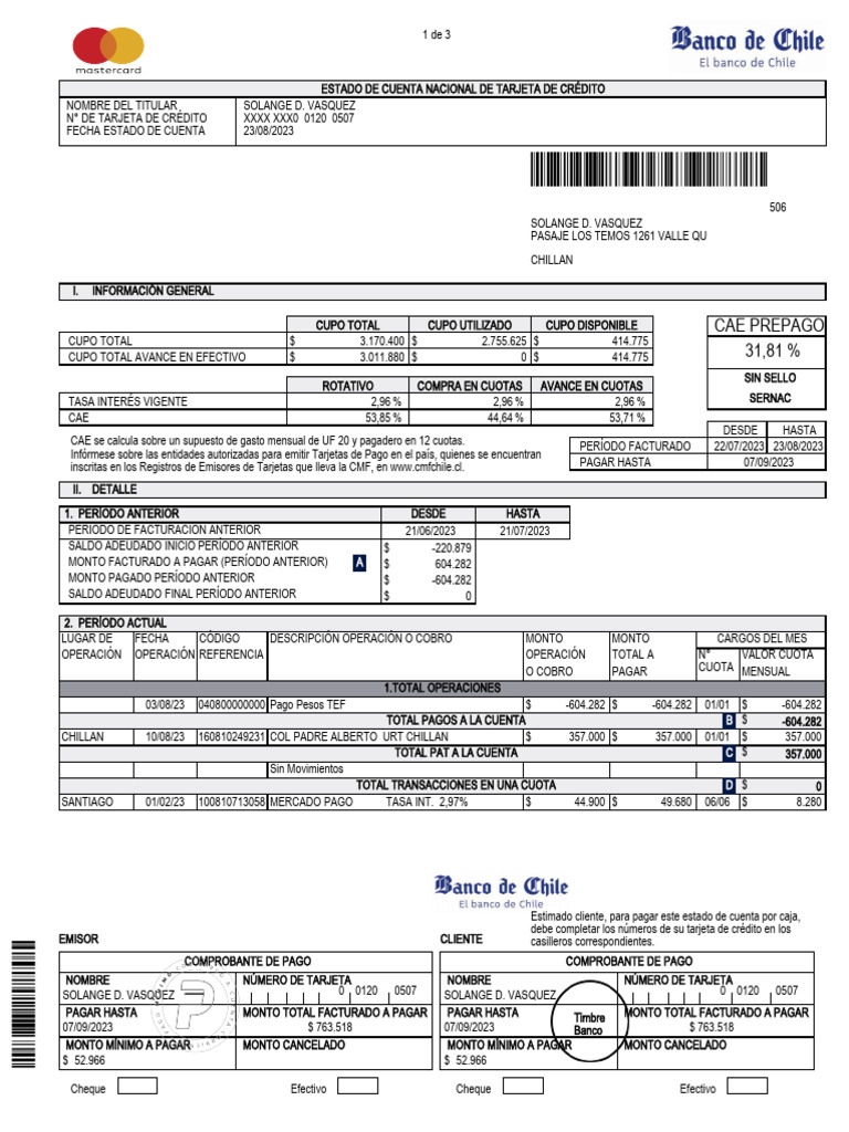 CAE se calcula sobre un supuesto de gasto mensual de UF 20 y pagadero en 12 cuotas. PERÍODO FACTURADO 22/07/2023 23/08/2023