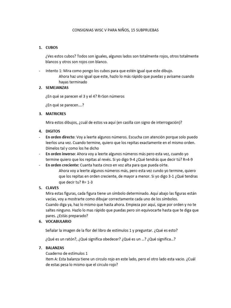 CONSIGNIAS WISC V PARA NIÑOS, 15 SUBPRUEBAS
