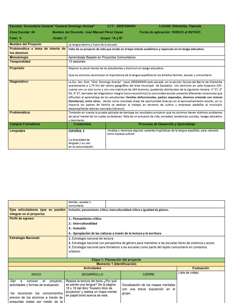 Nombre del Proyecto La lengua dentro y fuera de la escuela