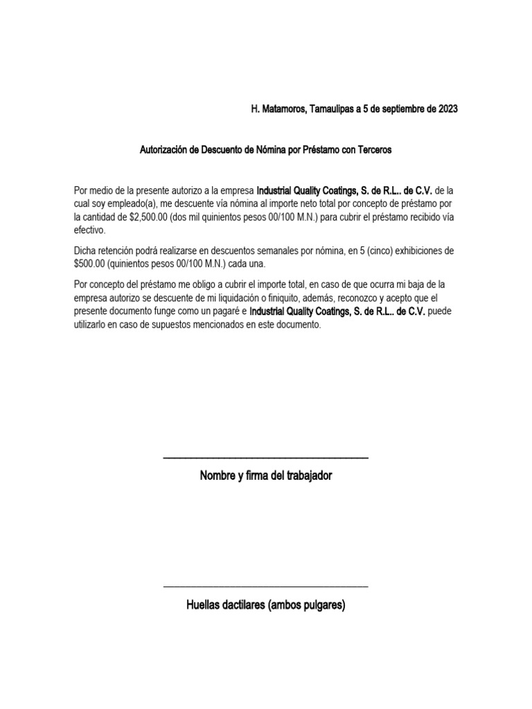 Autorización de Descuento de Nómina por Préstamo con Terceros