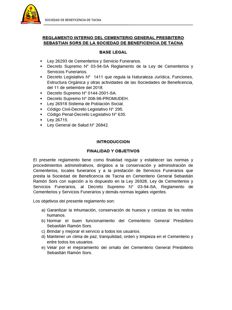 Cementerios y Servicios Funerarios y demás normas legales vigentes.