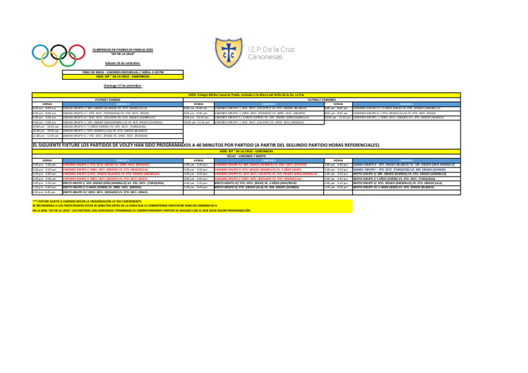 EL SIGUIENTE FIXTURE LOS PARTIDOS DE VÓLEY HAN SIDO PROGRAMADOS A 40 MINUTOS POR PARTIDO (A PARTIR DEL SEGUNDO PARTIDO HORAS REFERENCIALES)