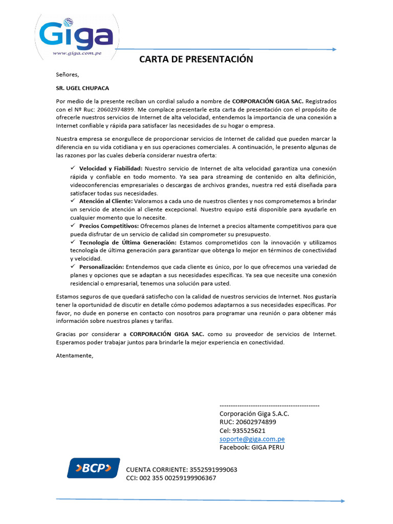 con el Nº Ruc: 20602974899. Me complace presentarle esta carta de presentación con el propósito de