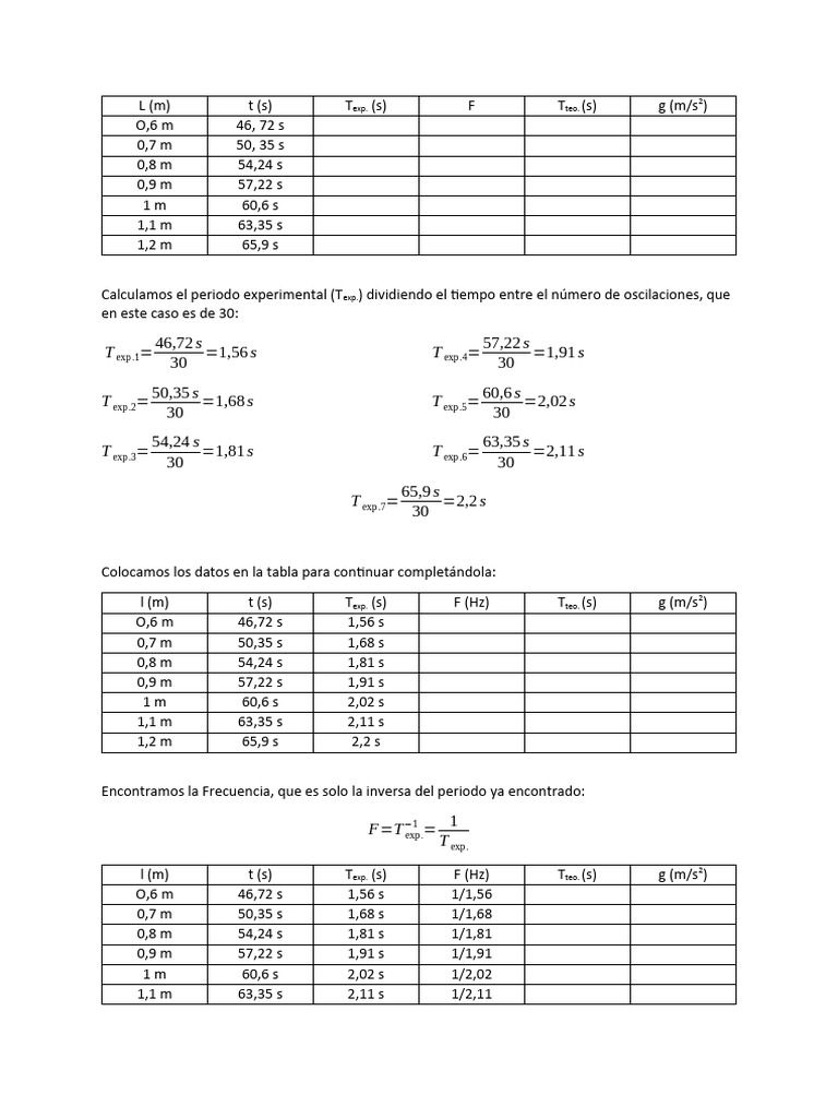 Calculamos el periodo experimental (T exp.) dividiendo el tiempo entre el número de oscilaciones, que