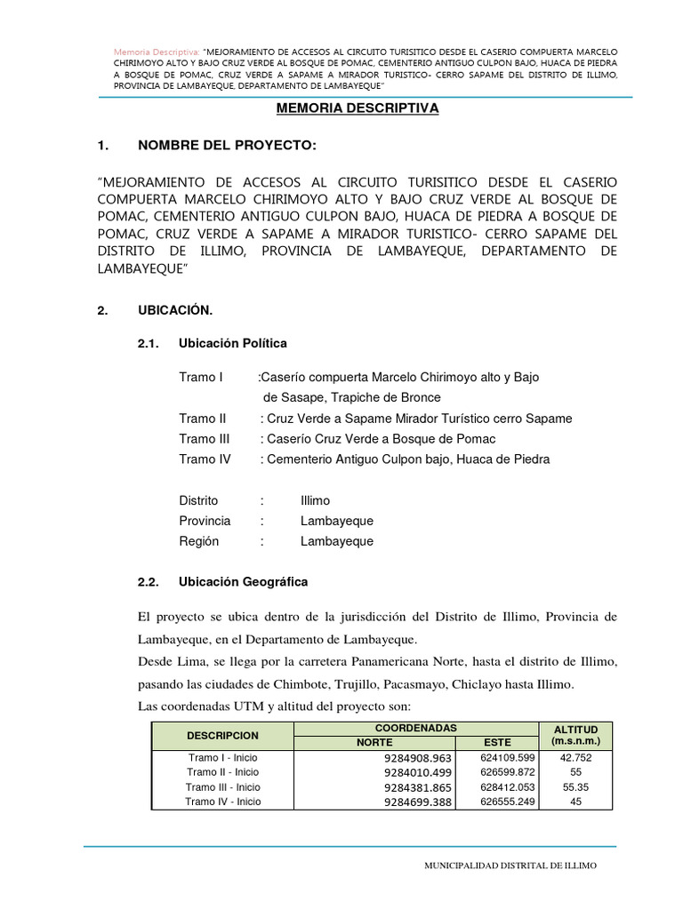 Memoria Descriptiva: “MEJORAMIENTO DE ACCESOS AL CIRCUITO TURISITICO DESDE EL CASERIO COMPUERTA MARCELO