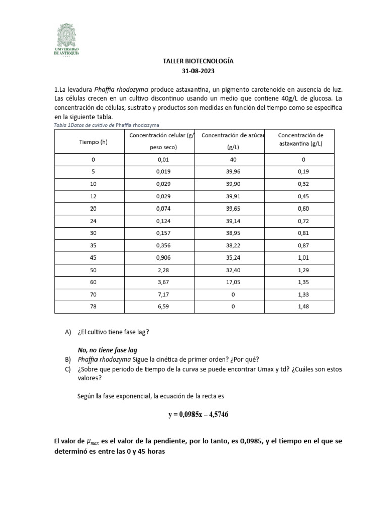 E) Usando el resultado de (d) estime la velocidad especifica de producción de astaxantina a las