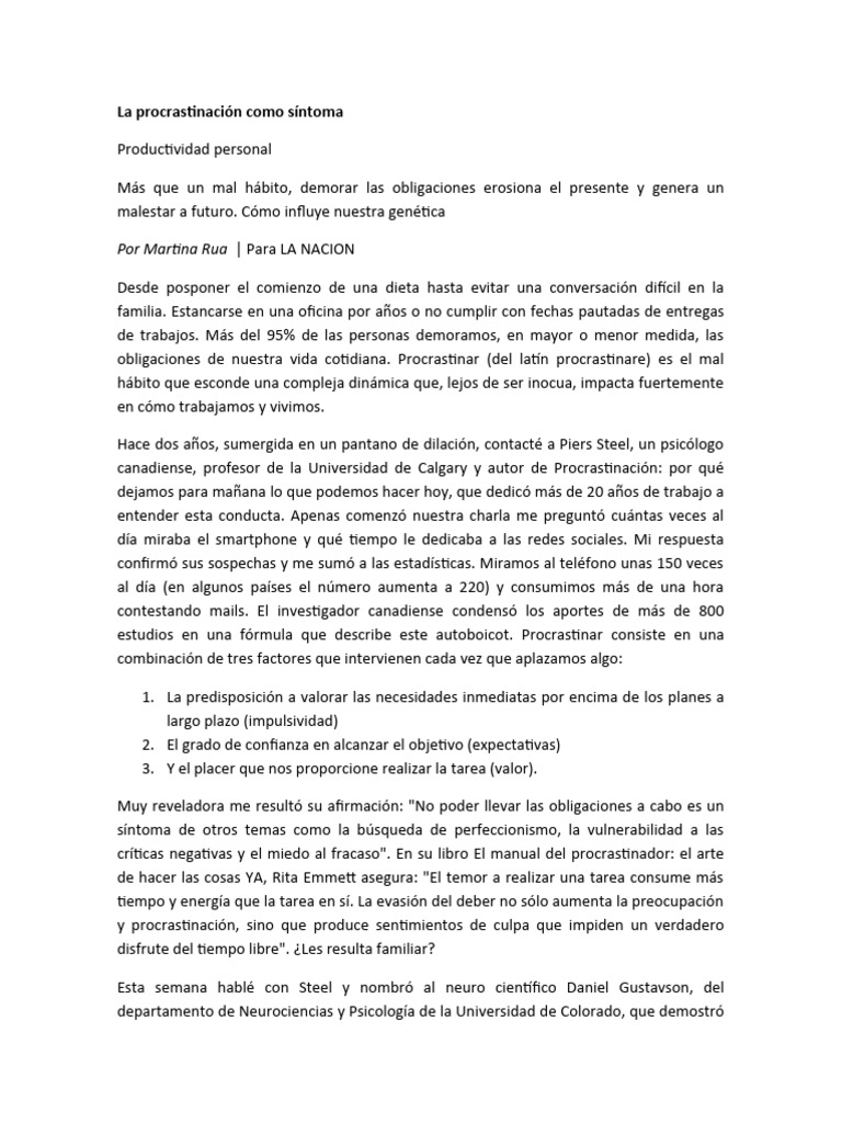 estudios en una fórmula que describe este autoboicot. Procrastinar consiste en una