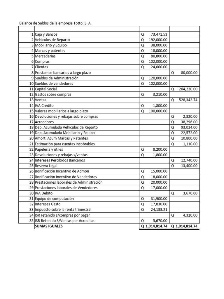 Balance de Saldos de la empresa Totto, S. A.
