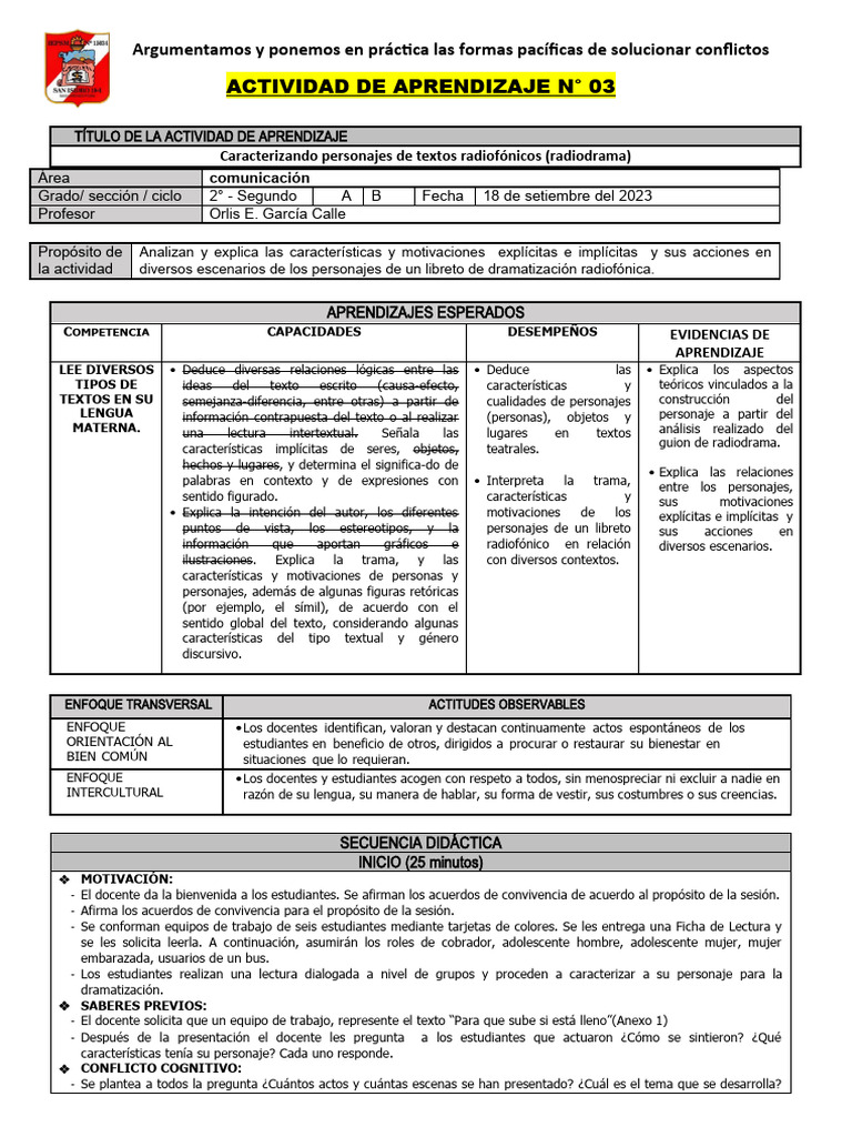 - Se presenta el aprendizaje esperado y la sesión denominada: Caracterizando personajes de textos radiofónicos