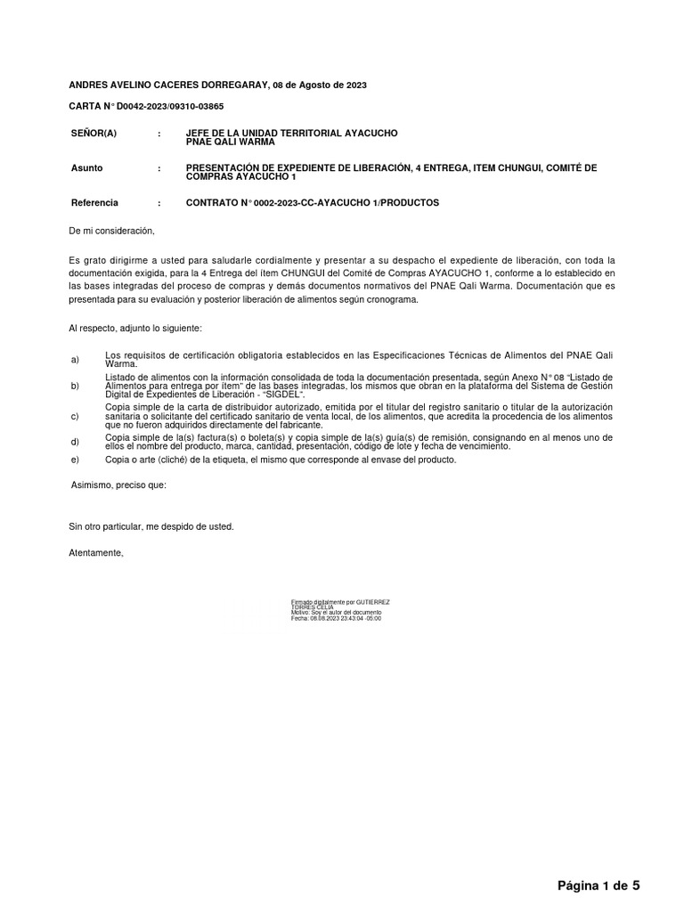 documentación exigida, para la 4 Entrega del ítem CHUNGUI del Comité de Compras AYACUCHO 1, conforme a lo establecido en