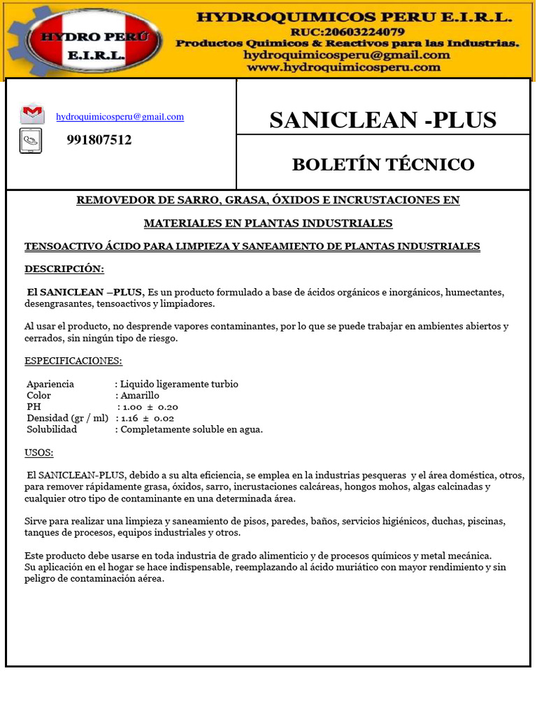 El SANICLEAN –PLUS, Es un producto formulado a base de ácidos orgánicos e inorgánicos, humectantes,