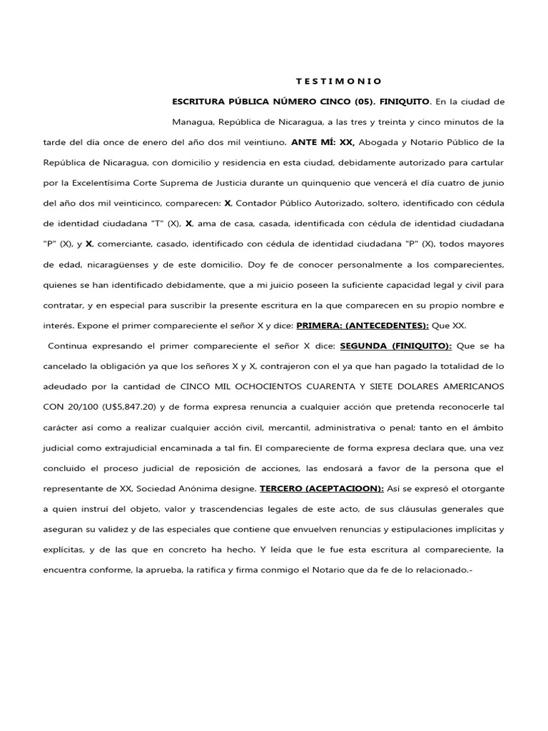 ESCRITURA PÚBLICA NÚMERO CINCO (05). FINIQUITO. En la ciudad de