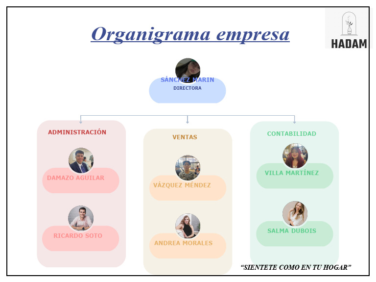 La empresa tiene una estructura jerárquica con la Directora Sánchez Marín a cargo. Debajo de ella hay departamentos de Administración, Contabilidad y Ventas cada uno con un jefe. El lema de la empresa es "Sientete como en tu hogar".
