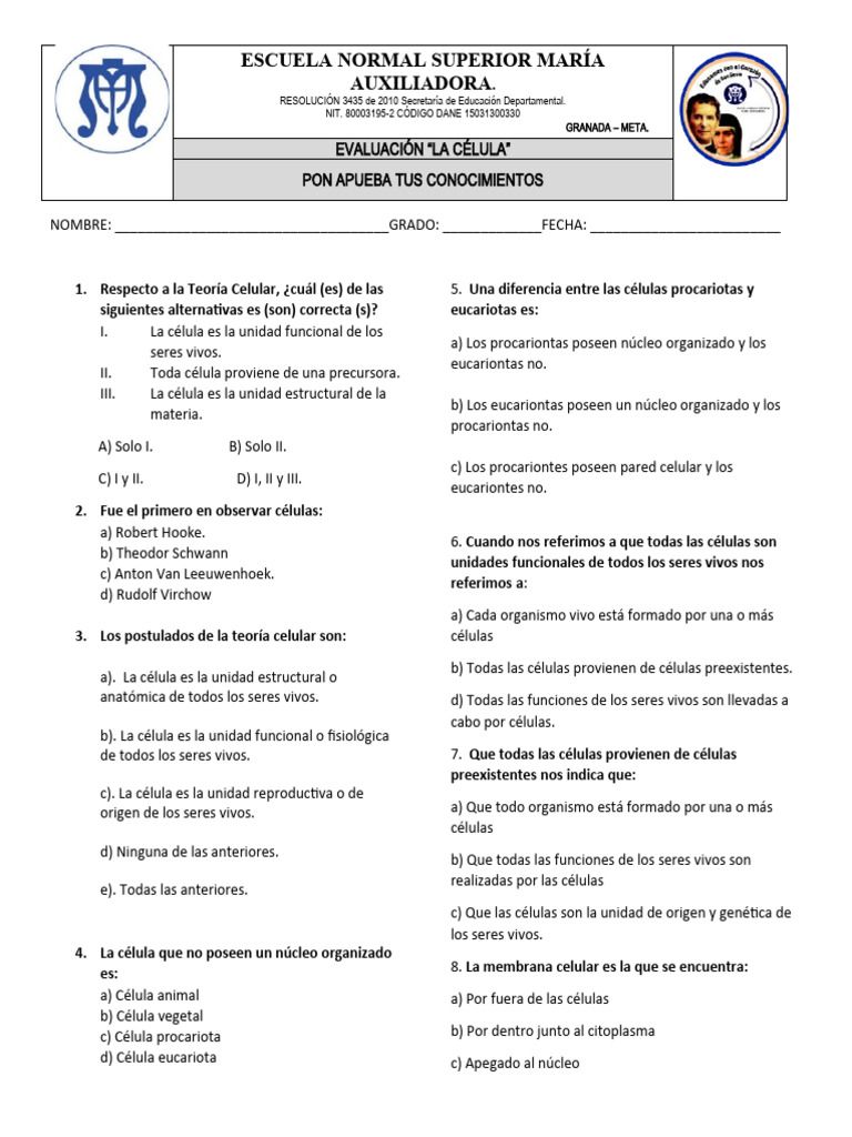 1. Respecto a la Teoría Celular, ¿cuál (es) de las 5. Una diferencia entre las células procariotas y