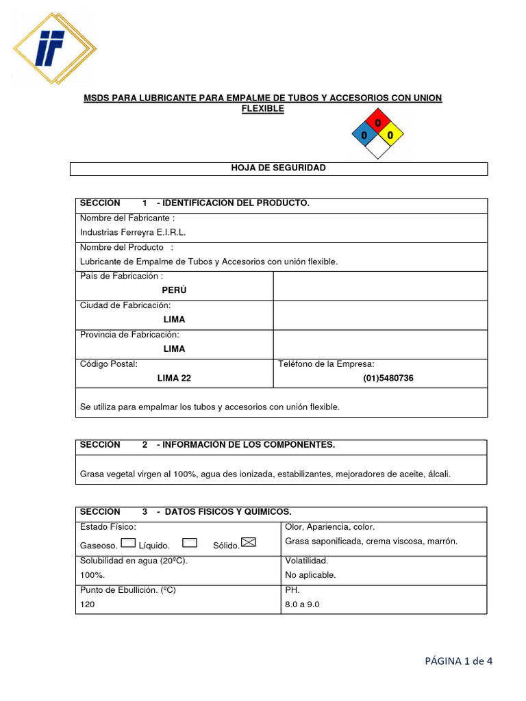 MSDS PARA LUBRICANTE PARA EMPALME DE TUBOS Y ACCESORIOS CON UNION