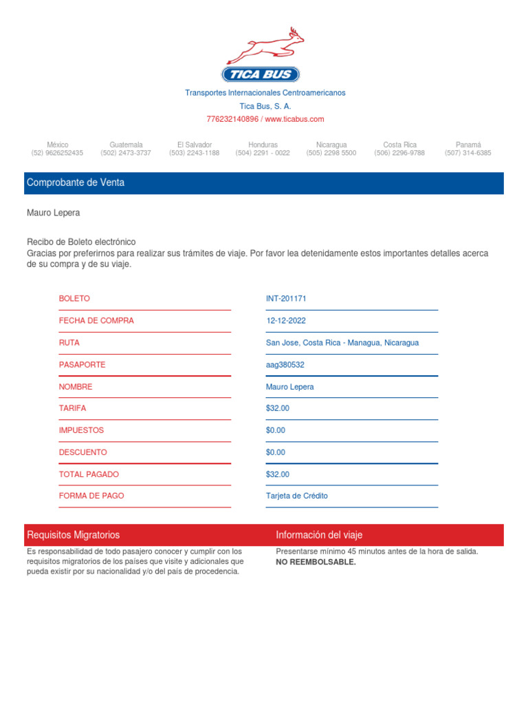 Tiquete de Viaje San Jose, Costa Rica - Managua, eTicket INT- 201171