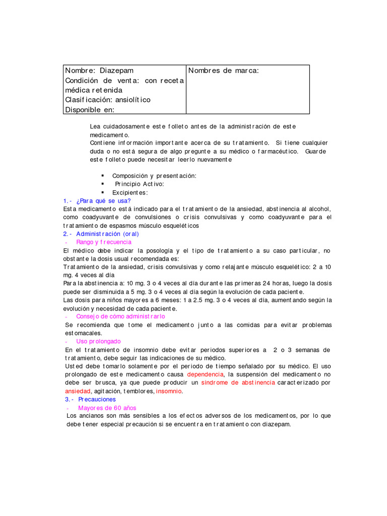 Tratamiento de la ansiedad, crisis convulsivas y como relajante músculo esquelético: 2 a 10