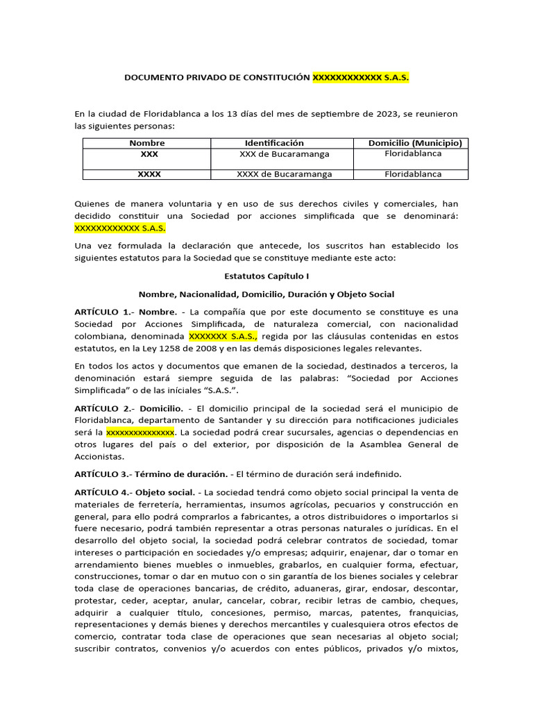 DOCUMENTO PRIVADO DE CONSTITUCIÓN XXXXXXXXXXXX S.A.S.