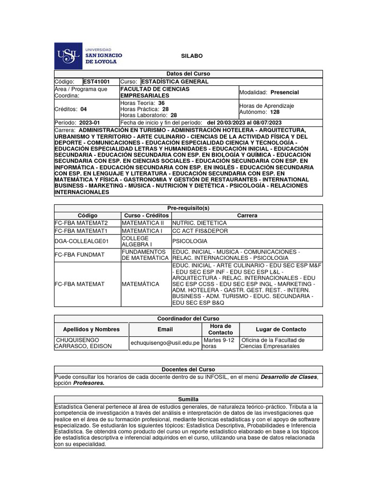 Estadística General pertenece al área de estudios generales, de naturaleza teórico-práctico. Tributa a la