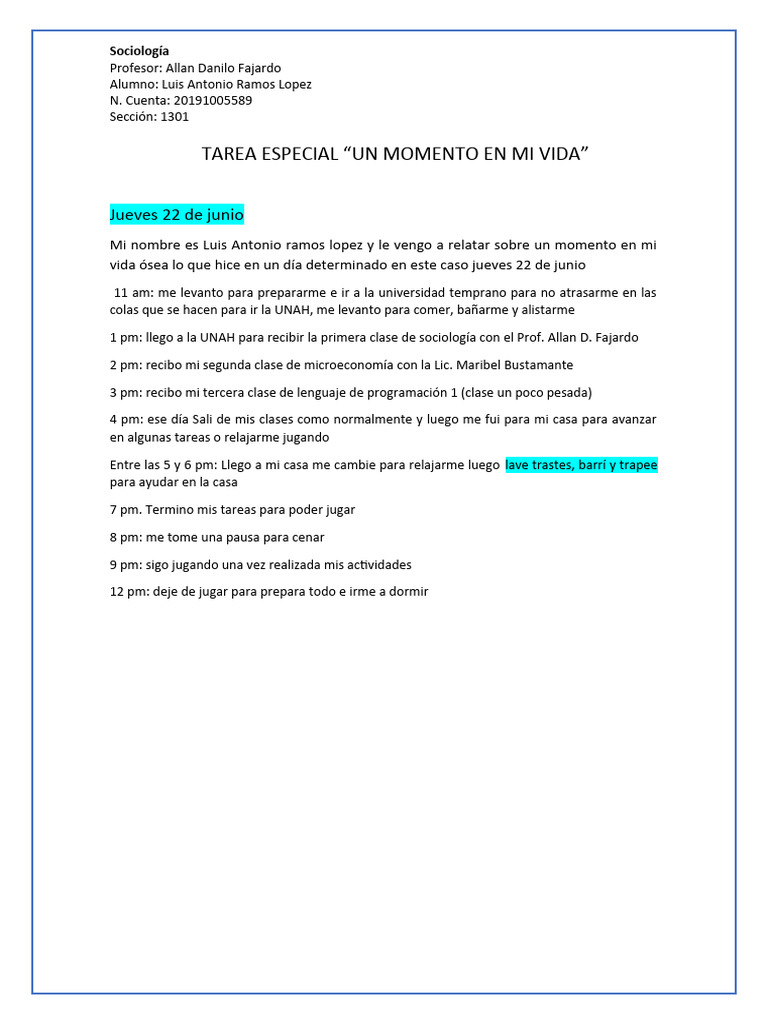 TAREA ESPECIAL “UN MOMENTO EN MI VIDA”