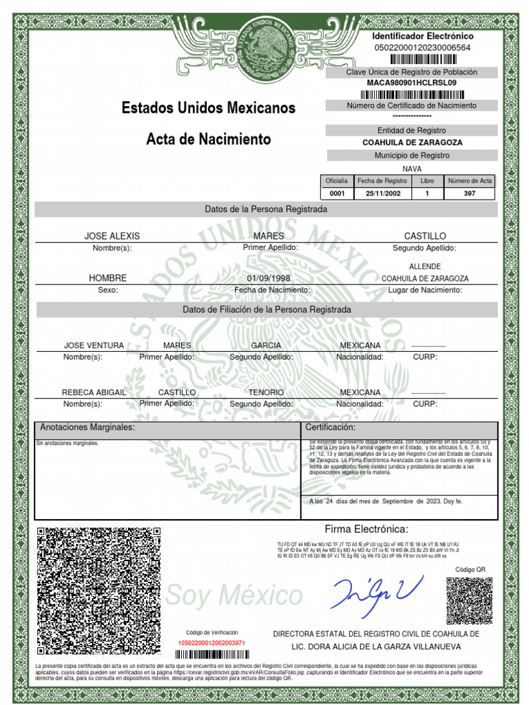 Acta de Nacimiento COAHUILA DE ZARAGOZA