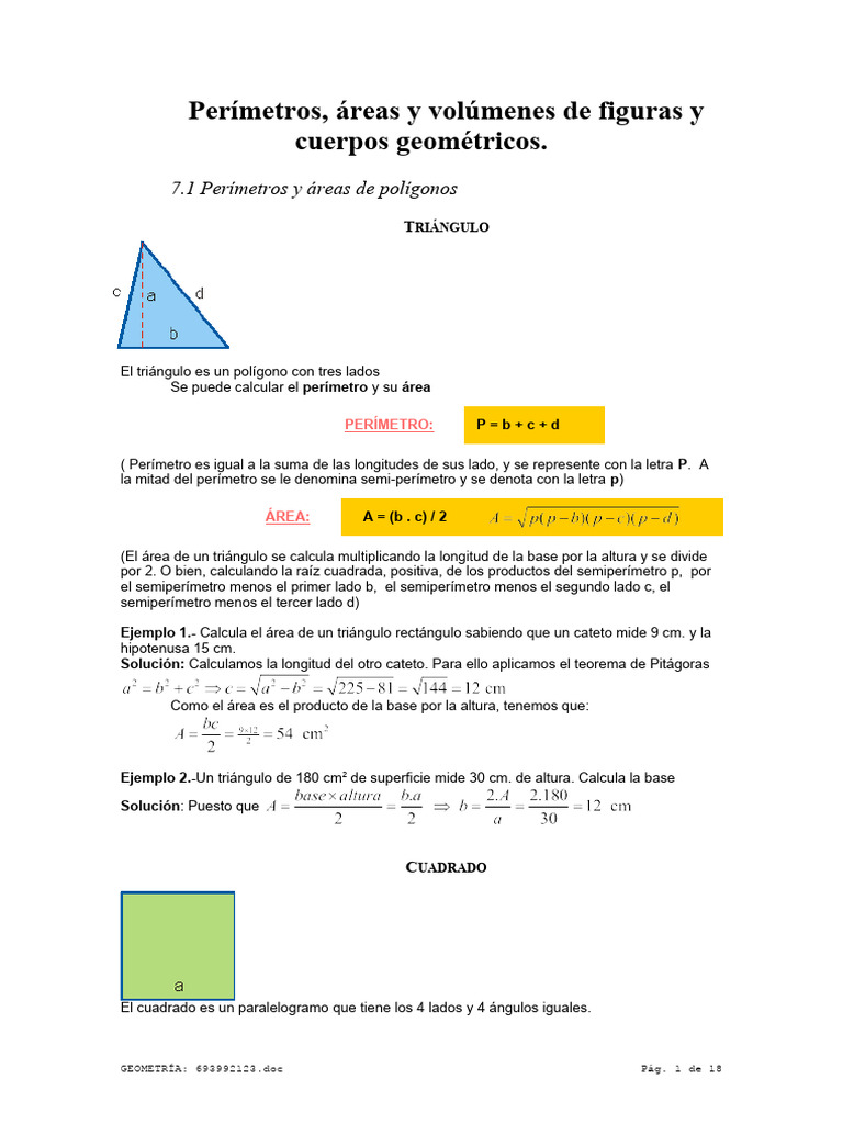FORMULAS DE PERÍMETROS, ÁREAS Y VOLÚMENES DE DISTINTOS CUERPOS