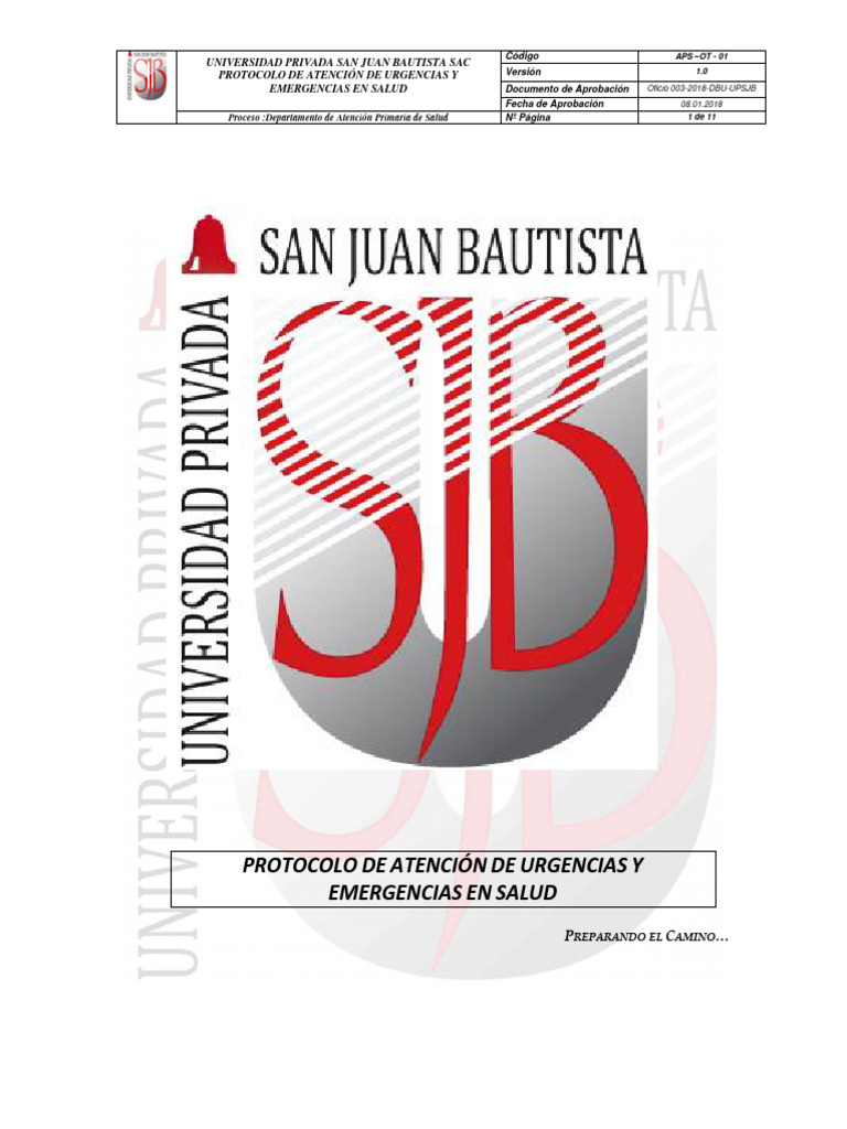 EMERGENCIAS EN SALUD Documento de Aprobación Oficio 003-2018-DBU-UPSJB