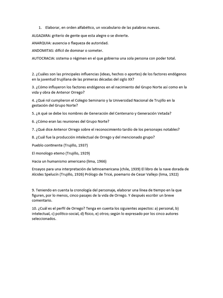 figuren, por lo menos, cinco pasajes de la vida de Orrego. Y después escribir un breve