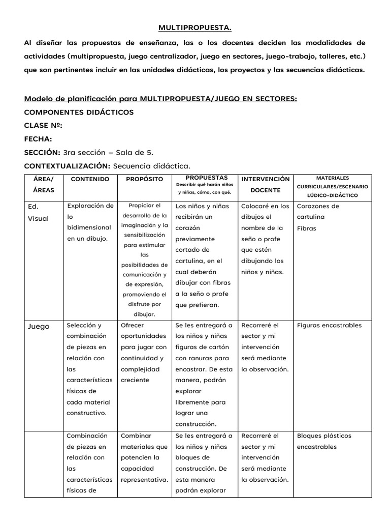 Modelo de planificación para MULTIPROPUESTA/JUEGO EN SECTORES: