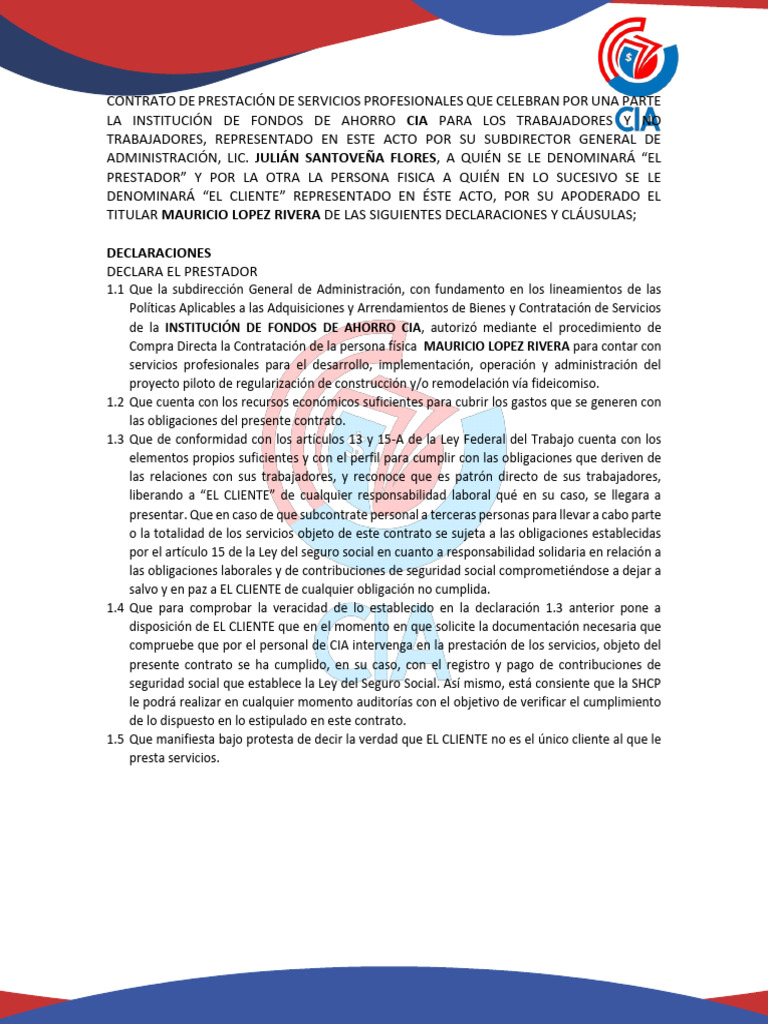 TITULAR MAURICIO LOPEZ RIVERA DE LAS SIGUIENTES DECLARACIONES Y CLÁUSULAS;