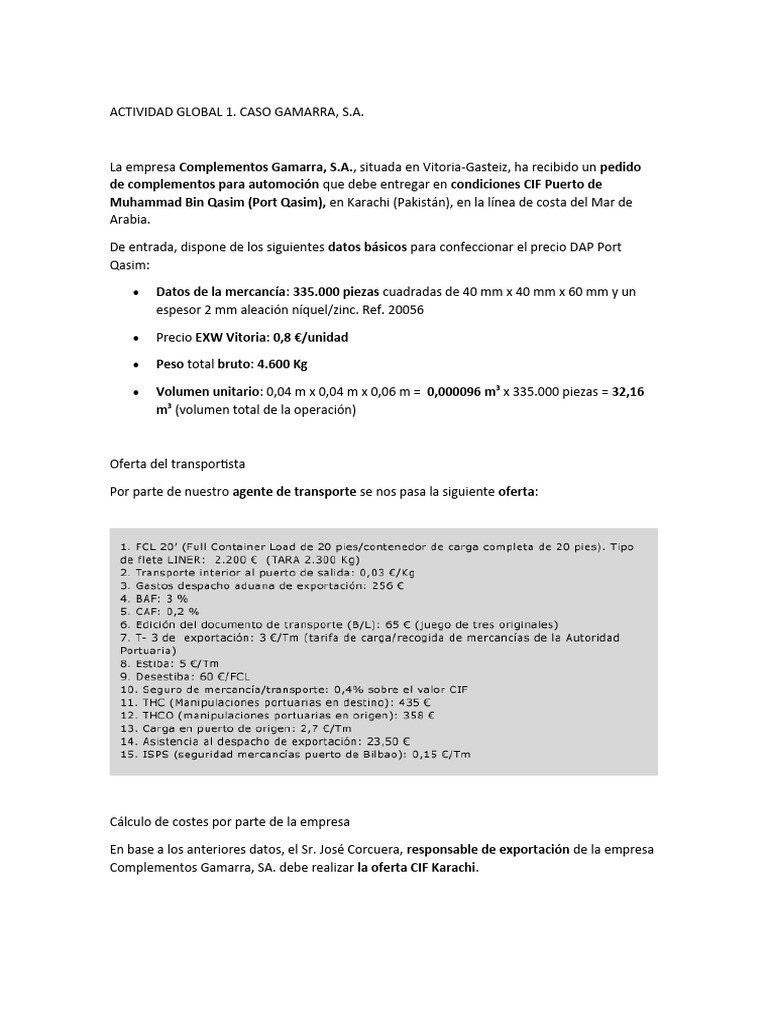 ACTIVIDAD GLOBAL 1. CASO GAMARRA, S.A.