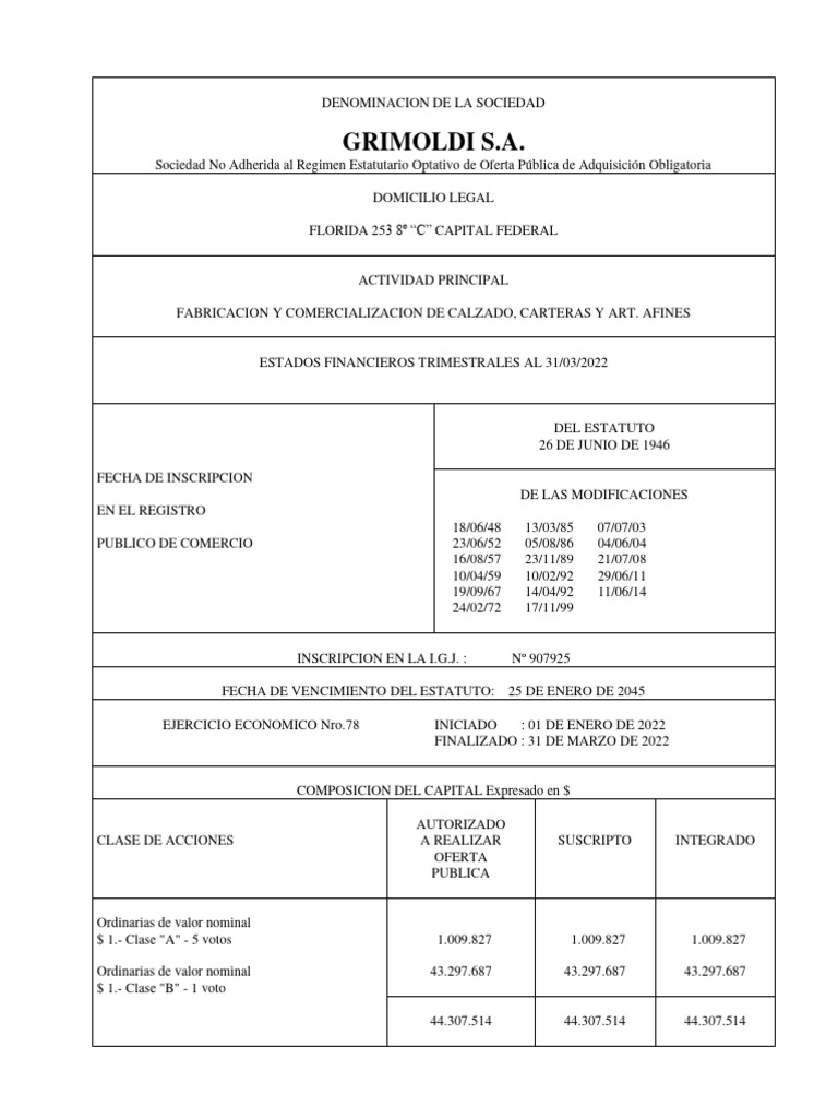 Grimuru S.A. Industrialización y comercialización de productos varios 31/03/2022 87.737 37.520.000 239.592.030 100