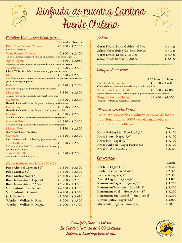Completa (tomate, chucrut, salsa verde, mayonesa Fuente Chilena) $ 4.850 Porotos Verdes Cocinados al dente $ 900
