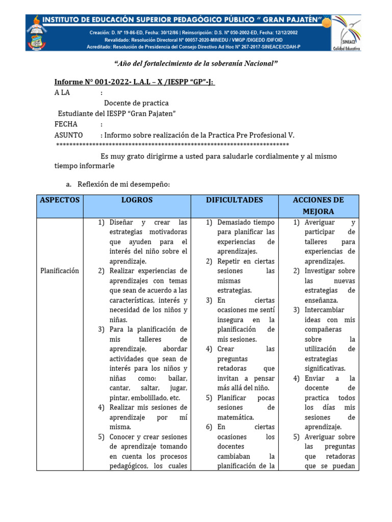 Informe N° 001-2022- L.A.L – X /IESPP “GP”-J:
