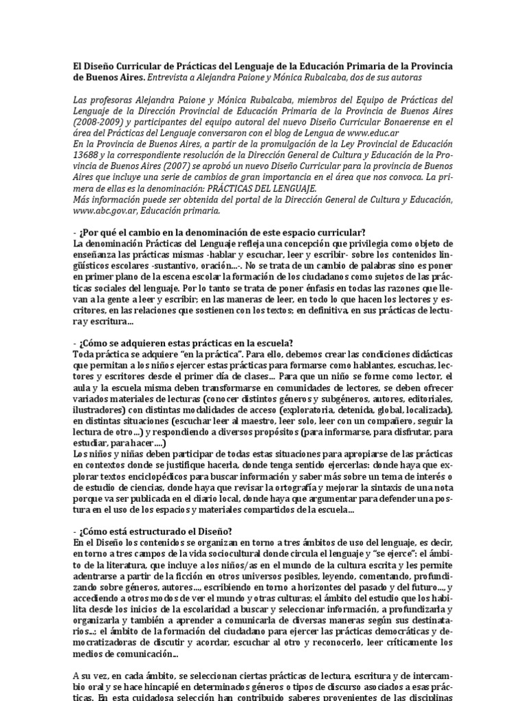 Entrevista a Alejandra Paione y Mnica Rubalcaba, dos de sus autoras Las profesoras Alejandra Paione y Mnica Rubalcaba, miembros del Equipo de Prcticas del Lenguaje de la Direccin Provincial de Educacin Primaria de la Provincia de Buenos Aires (2008-2009) y participantes del equipo autoral del nuevo Diseo Curricular Bonaerense en el rea del Prcticas del Lenguaje conversaron con el blog de Lengua de www.educ.ar En la Provincia de Buenos Aires, a partir de la promulgacin de la Ley Provincial de Educacin 13688 y la correspondiente resolucin de la Direccin General de Cultura y Educacin de la Provincia de Buenos Aires (2007) se aprob un nuevo Diseo Curricular para la provincia de Buenos Aires que incluye una serie de cambios de gran importancia en el rea que nos convoca. La primera de ellas es la denominacin: PRCTICAS DEL LENGUAJE. Ms informacin puede ser obtenida del portal de la Direccin General de Cultura y Educacin, www.abc.gov.ar, Educacin primaria. - Por qu el cambio en la denominacin de este espacio curricular? La denominacin Prcticas del Lenguaje refleja una concepcin que privilegia como objeto de enseanza las prcticas mismas -hablar y escuchar, leer y escribir- sobre los contenidos lingsticos escolares -sustantivo, oracin...-. No se trata de un cambio de palabras sino es poner en primer plano de la escena escolar la formacin de los ciudadanos como sujetos de las prcticas sociales del lenguaje. Por lo tanto se trata de poner nfasis en todas las razones que llevan a la gente a leer y escribir; en las maneras de leer, en todo lo que hacen los lectores y escritores, en las relaciones que sostienen con los textos; en definitiva, en sus prcticas de lectura y escritura - Cmo se adquieren estas prcticas en la escuela? Toda prctica se adquiere en la prctica. Para ello, debemos crear las condiciones didcticas que permitan a los nios ejercer estas prcticas para formarse como hablantes, escuchas, lectores y escritores desde el primer da de clases Para que un nio se forme como lector, el aula y la escuela misma deben transformarse en comunidades de lectores, se deben ofrecer variados materiales de lecturas (conocer distintos gneros y subgneros, autores, editoriales, ilustradores) con distintas modalidades de acceso (exploratoria, detenida, global, localizada), en distintas situaciones (escuchar leer al maestro, leer solo, leer con un compaero, seguir la lectura de otro) y respondiendo a diversos propsitos (para informarse, para disfrutar, para estudiar, para hacer.) Los nios y nias deben participar de todas estas situaciones para apropiarse de las prcticas en contextos donde se justifique hacerla, donde tenga sentido ejercerlas: donde haya que explorar textos enciclopdicos para buscar informacin y saber ms sobre un tema de inters o de estudio de ciencias, donde haya que revisar la ortografa y mejorar la sintaxis de una nota porque va ser publicada en el diario local, donde haya que argumentar para defender una postura en el uso de los espacios y materiales compartidos de la escuela - Cmo est estructurado el Diseo? En el Diseo los contenidos se organizan en torno a tres mbitos de uso del lenguaje, es decir, en torno a tres campos de la vida sociocultural donde circula el lenguaje y se ejerce: el mbito de la literatura, que incluye a los nios/as en el mundo de la cultura escrita y les permite adentrarse a partir de la ficcin en otros universos posibles, leyendo, comentando, profundizando sobre gneros, autores, escribiendo en torno a horizontes del pasado y del futuro..., y accediendo a otros modos de ver el mundo y otras culturas; el mbito del estudio que los habilita desde los inicios de la escolaridad a buscar y seleccionar informacin, a profundizarla y organizarla y tambin a aprender a comunicarla de diversas maneras segn sus destinatarios...; el mbito de la formacin del ciudadano para ejercer las prcticas democrticas y democratizadoras de discutir y acordar, escuchar al otro y reconocerlo, leer crticamente los medios de comunicacin... A su vez, en cada mbito, se seleccionan ciertas prcticas de lectura, escritura y de intercambio oral y se hace hincapi en determinados gneros o tipos de discurso asociados a esas prcticas. En esta cuidadosa seleccin han contribuido saberes provenientes de las disciplinas lingsticas y literarias de referencia as como decisiones didcticas guiadas por los propsitos de enseanza que se pretende lograr. Tal articulacin queda en evidencia a travs de la presencia explcita de situaciones e intervenciones didcticas que buscan dar orientaciones sobre el sentido en que los contenidos deberan ser comunicados. - Por qu no hay contenidos por ao? El rea de Prcticas del lenguaje no plantea la distribucin de contenidos por ao. Esto es as porque el acceso a la alfabetizacin o la formacin de lectores estn profundamente relacionados con las oportunidades que los nios/as hayan tenido de interactuar con los textos y de