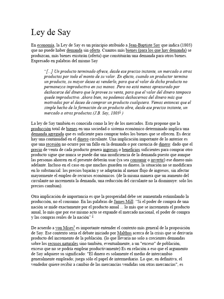 En economía, la Ley de Say es un principio atribuido a Jean-Baptiste Say que indica (1803)