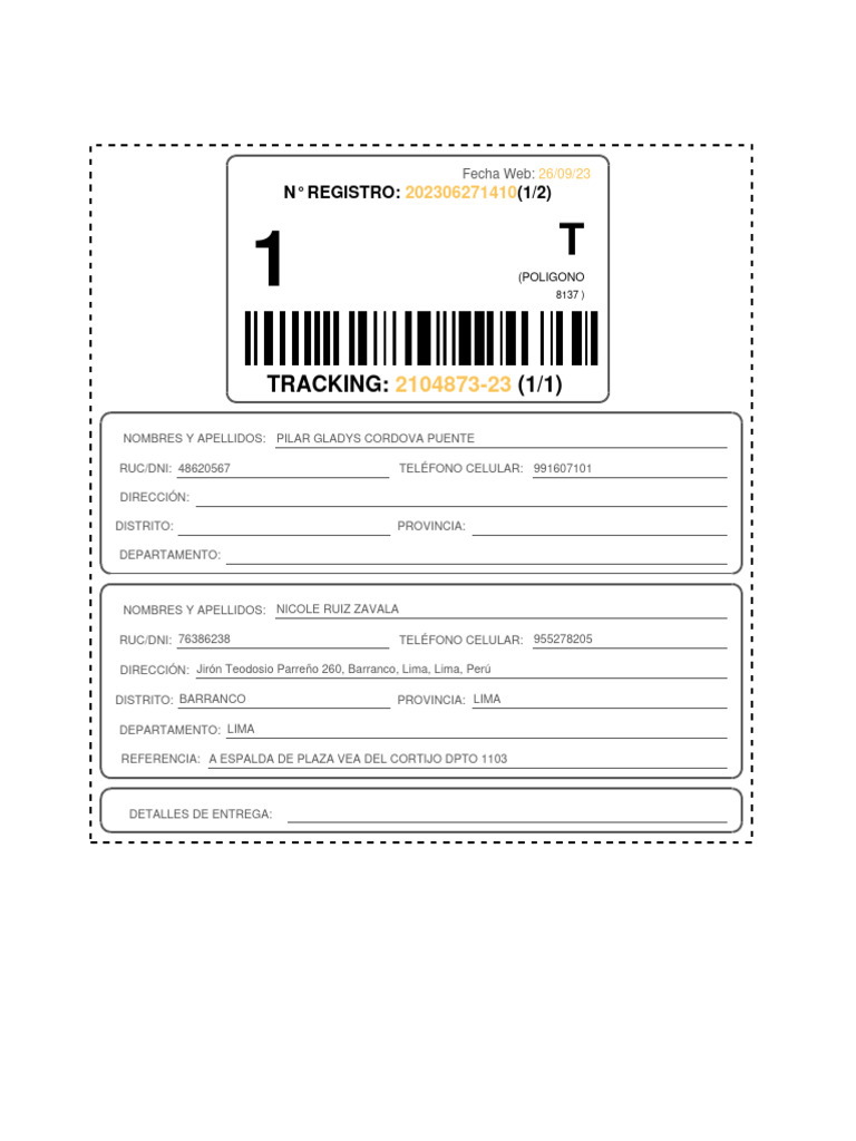RUC/DNI: 48620567 TELÉFONO CELULAR: 991607101