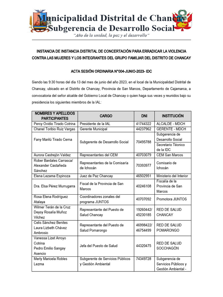 Municipal Nº004-2023-MDCH/A, de creación de la DE INSTANCIA DISTRITAL DE CONCERTACIÓN