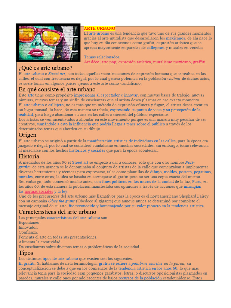 El arte urbano o Street art, son todas aquellas manifestaciones de expresión humana que se realiza en las