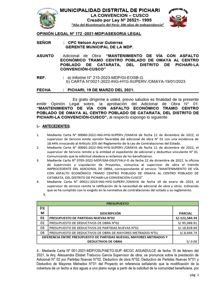 OPINIÓN LEGAL Nº 172 -2021-MDP/ASESORIA LEGAL