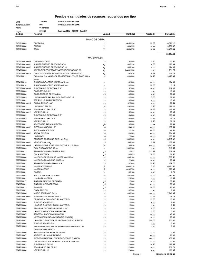 Subpresupuesto 001 VIVIENDA UNIFAMILIAR