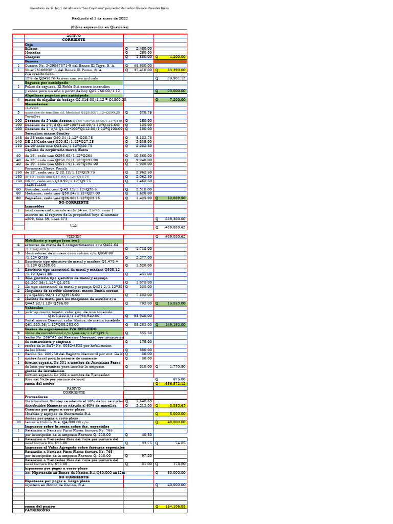 Inventario inicial No.1 del almacen "San Cayetano" propiedad del señor Filemón Paredes Rojas
