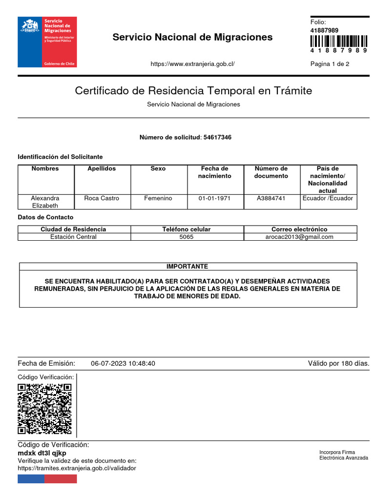 Importante: Este certificado tiene una validez de SEIS MESES desde la fecha de su emisión y será prorrogado de forma