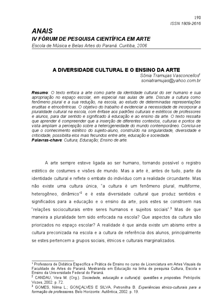 A arte sempre esteve ligada ao ser humano, tornando possvel o registro esttico de costumes e vises de mundo. Mas a arte , antes de tudo, parte da identidade cultural e reflete o embate do indivduo com a realidade circundante. Mas no existe uma cultura nica, a cultura um fenmeno plural, multiforme, heterogneo, dinmico2 e esta diversidade cultural que produz sentidos e significados para a educao e o ensino da arte, pois estes se constroem nas relaes socioculturais entre seres humanos e sujeitos sociais.3 Mas de que maneira a pluralidade tem sido enfocada na escola? Que aspectos da cultura so priorizados no espao escolar? A realidade que ainda existe um abismo entre a cultura preconizada na escola e a cultura de referncia dos alunos, principalmente se estes pertencem a grupos sociais, tnicos e culturais marginalizados.