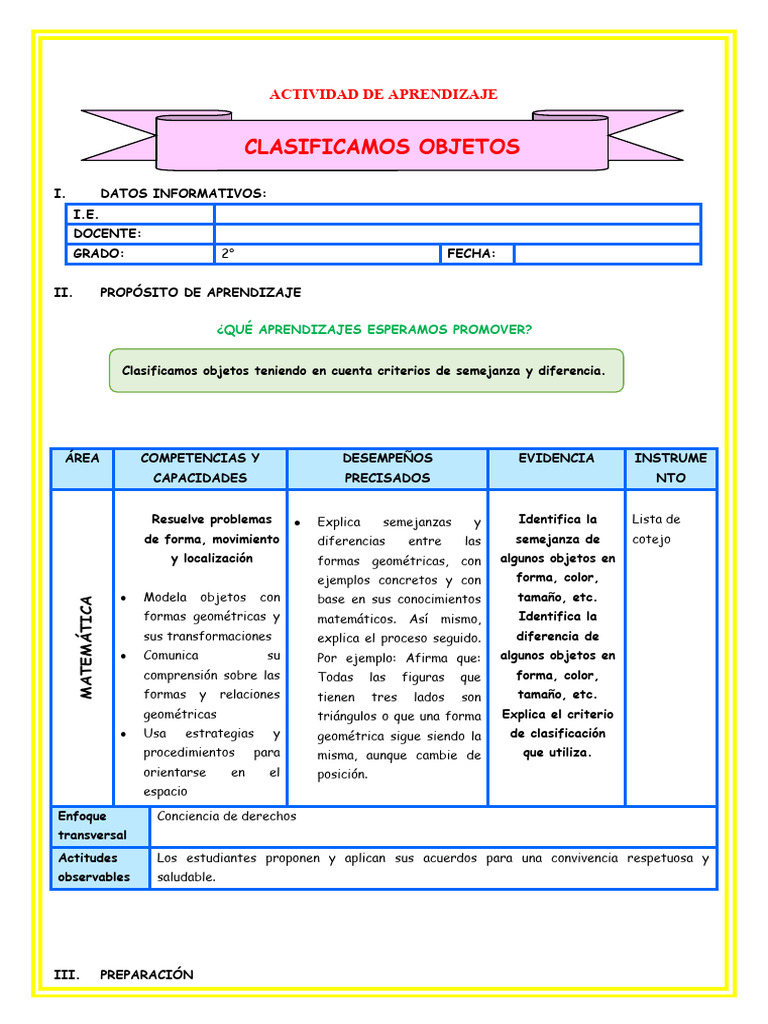 Se anuncia el propósito: Hoy vamos a clasificar objetos de nuestro entorno de acuerdo a sus